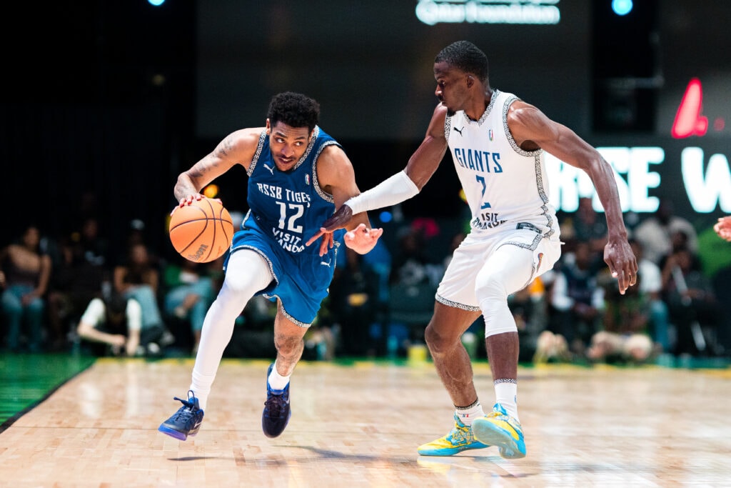 Leonard Randall II #12 of the RSSB Tigers drives to the basket during the game against Johannesburg Giants on April 1, 2026 at SunBet Arena in Pretoria, South Africa.