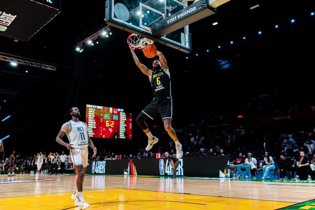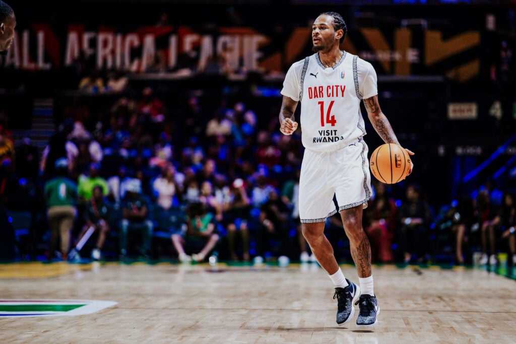 David Michineau #6 of the Dar City Basketball Club dunks the ball during the game against Nairobi City Thunder on March 28, 2026, at SunBet Arena in Pretoria, South Africa.
